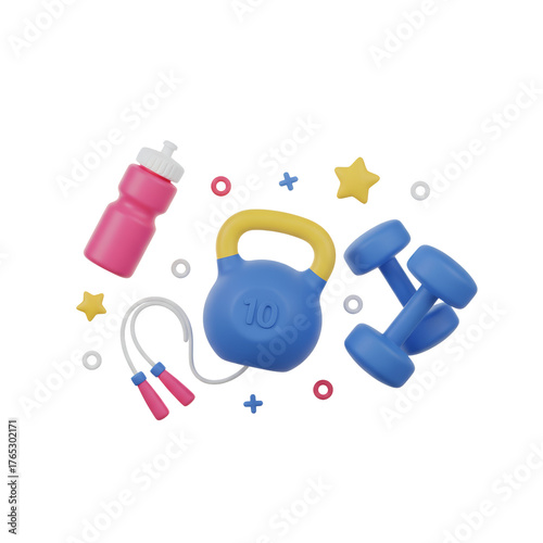 Vibrant fitness equipment arrangement on clean backdrop symbolizing well being pursuit
