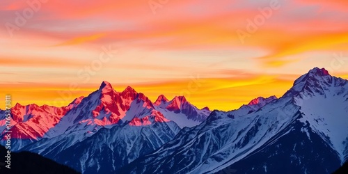 Majestic mountain range at sunset, vibrant colors reflecting on snow capped peaks, beautiful, landscape
