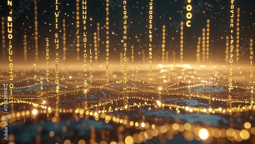 Matrix rain style golden alphanumeric data stream and circuit board landscape.
