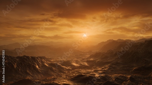 Stunning hyper realistic sunrise on venus with glowing lava rivers and dense yellow orange clouds
