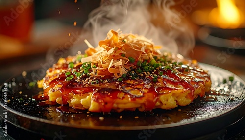 Cinematic macro shot of okonomiyaki on a hotplate, sauce glazing on top, bonito flakes moving in the steam, warm moody lighting