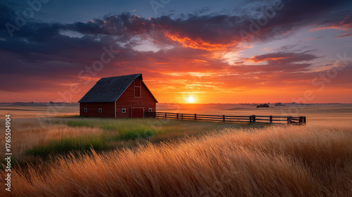 Red barn sunset field grass rural landscape with dramatic sky and warm light creating peaceful countryside scene