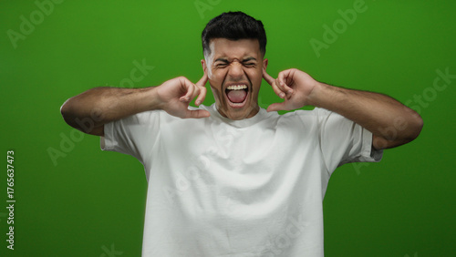 Young man in white shirt with facial expressions covering ears against green background isolated