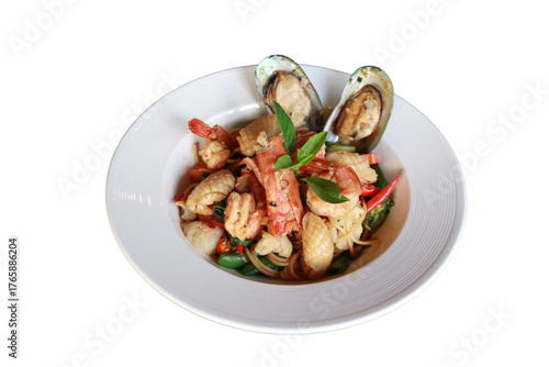 A delightful seafood dish beautifully arranged on a plate, showcasing a variety of fresh ingredients and vibrant colors. The dish is a culinary masterpiece, tempting taste buds