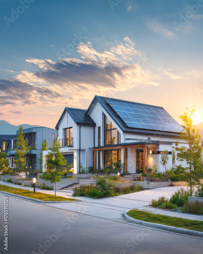 Modern house with solar panels shines under the evening sun in a tranquil neighborhood