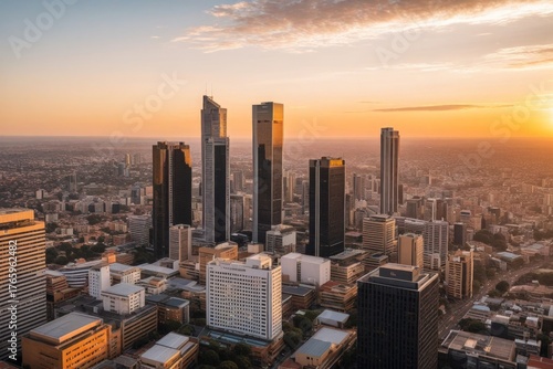 Moderne Skyline von Johannesburg bei Sonnenuntergang mit Wolken und goldenen Farben
