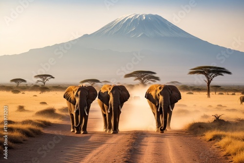 Eine majestätische Elefantenherde zieht durch die Savanne mit dem Kilimandscharo im Hintergrund
