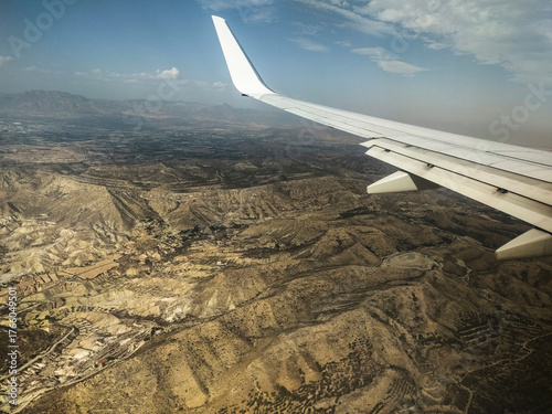 An airplane wing soars above a vast, arid mountainous landscape with scattered settlements under a partly cloudy sky.