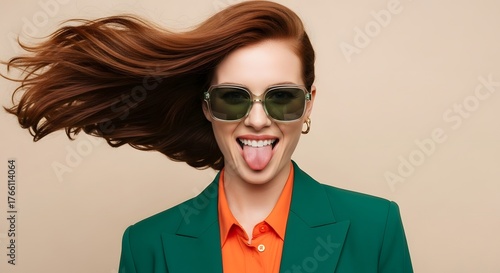 A playful young woman with red hair and sunglasses sticks out her tongue while her hair blows in the wind, wearing a green blazer and orange shirt