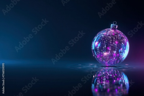 glass Christmas bauble with binary code and glowing neon reflections, dark blue background, banner with copy space. futuristic holiday, IT business greeting card, corporate New Year, digital marketing