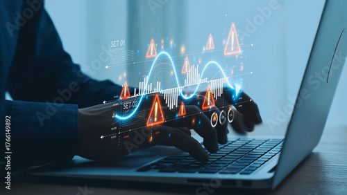Economic caution visual showing risk alerts and financial volatility. Warning signs highlight economic downturn, market risk, finance crisis, and uncertainty in data-driven analysis. Elide
