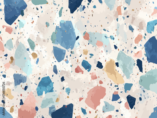 Un elegante motivo terrazzo vettoriale con frammenti color pastello, ideale per sfondi e design moderni, evocando un'estetica raffinata e contemporanea.