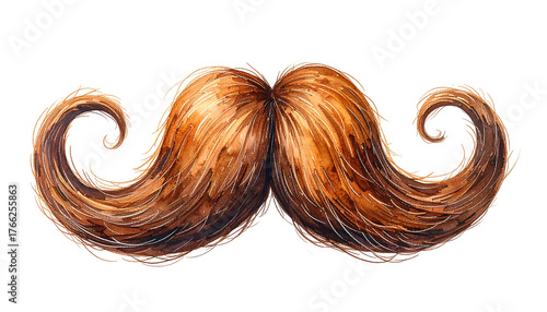 Watercolor depiction of a curly, brown mustache, isolated on a black background
