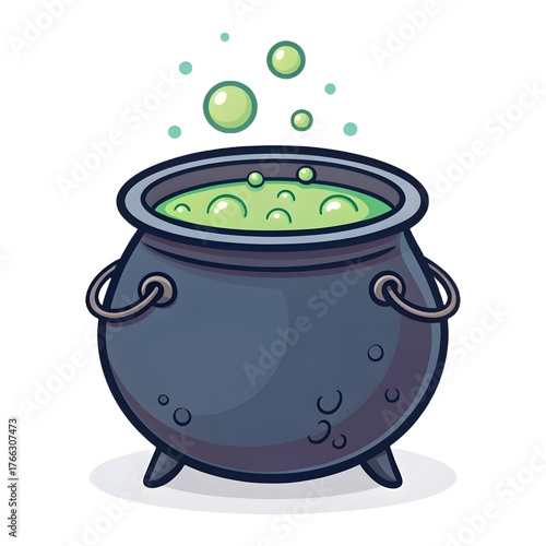 Bubbling green potion in a black witch s cauldron with steam and bubbles on a white background