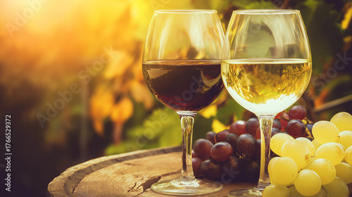 vineyard. Glasses of red and white wine with ripe grapes on a wooden table in a rustic vineyard setting. bar promotions, beverage menus, designed for food & beverage menus and cafe branding.