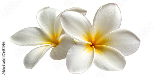 Close-up of Two White Plumeria Flowers with Yellow Centers on Black Background frangipani isolated on a transparent background