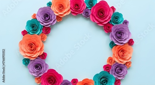 Coloridas flores de papel hechas a mano sobre fondo azul claro con espacio de copia en el centro