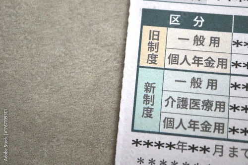 生命保険料控除の新旧制度区分。年末調整や確定申告の書類。