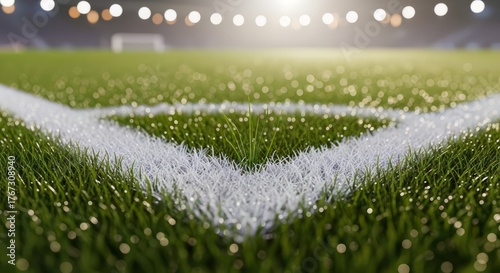 Close up of a soccer field corner with bright stadium lights