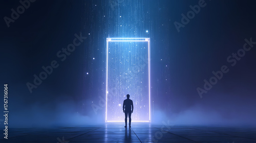 Silhouette Standing At Portal With Intense Light Future Gateway Intense Silhouette Figure Standing Before Light Filled Doorway To Another Dimension Abstract Man Dark Outline
