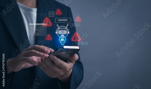 Businessman using smartphone with warning signs and AI chatbot icon, symbolizing mobile chatbot risks, data breaches, ethical AI concerns and cybersecurity threats in communication