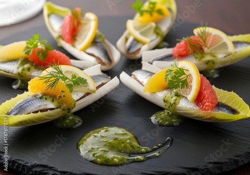 Gourmet Sardine Appetizers on Chicory, Grapefruit, Lemon, Dill and Green Sauce.