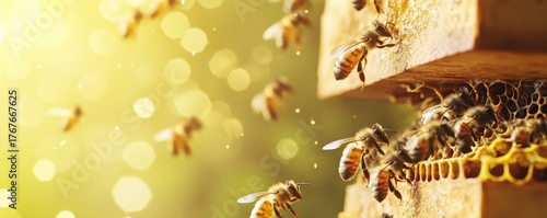 Close-up of bees working diligently on honeycomb with sunlight illuminating the hive environment