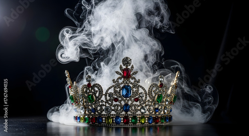 Ornate Crown with Jewels Surrounded by Smoke | Regal Headdress on Dark Background for Royalty, Fashion, and Luxury Concepts