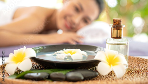 プルメリアの花が添えられたオイルマッサージの施術で女性が癒される極上のエステ体験