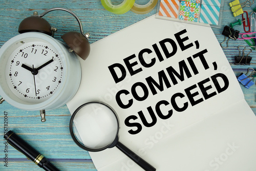 Decide, Commit, Succeed text written on notepad with alarm clock and magnifying glass flat lay on wooden background