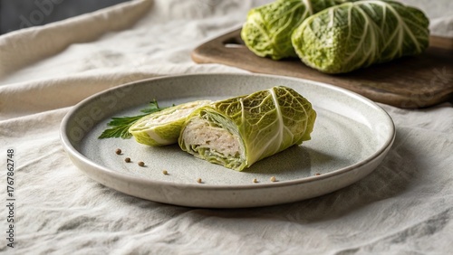 Savoring the beauty of a minimalist cabbage roll on a simple plate with a touch of spring greens