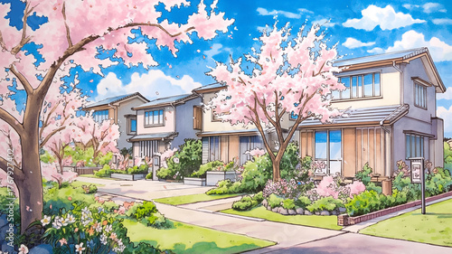 春の訪れを告げる満開の桜と春の花が彩るモダンで洗練された新築住宅のイラスト風景。明るく清潔感のある住まいと穏やかな通学路を描いた春の情景素材。