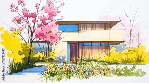 春の訪れを告げる満開の桜と春の花が彩るモダンで洗練された新築住宅のイラスト風景。明るく清潔感のある住まいと穏やかな通学路を描いた春の情景素材。