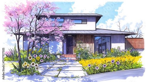 春の訪れを告げる満開の桜と春の花が彩るモダンで洗練された新築住宅のイラスト風景。明るく清潔感のある住まいと穏やかな通学路を描いた春の情景素材。