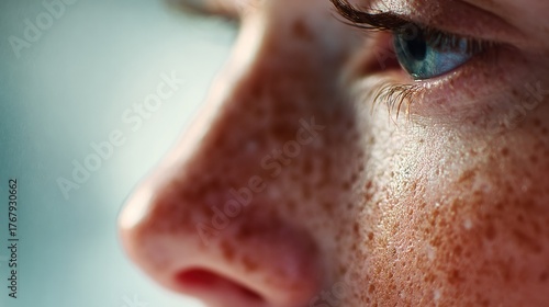 Freckled Close-Up of a Young Persons Face Highlighting Blue Eyes and Textured Skin