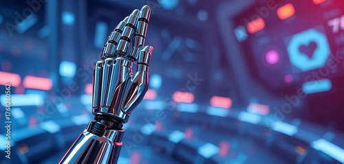 Sleek chrome robot arm raised in a crisp salute, futuristic backdrop, arm, machine
