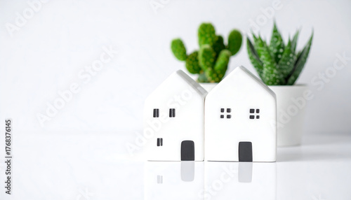 白い一戸建て模型とサボテンが共演する不動産の洗練されたミニマルな表現