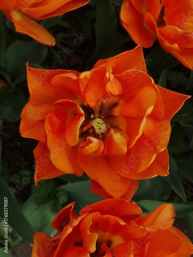 La fleur dominant l'image et le flou du reste du feuillage mettent l'accent sur la beauté et la texture de cette fleur printanière. La tulipe orange symbolise le bonheur, la gaieté et l'enthousiasme.