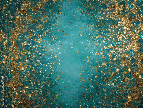 Kolor roku 2026 : Transformative Teal. Abstrakcyjne tło z złotym brokatem rozsypanym na turkusowo-niebieskiej, akwarelowej powierzchni. Efekt rozproszenia i blasku, idealne na uroczystości.