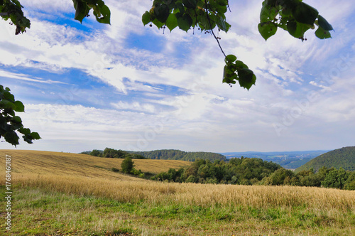 Góry Wałbrzyskie - widok z Przełęczy Pojednania. Złote pole pszenicy z łagodnymi wzgórzami pod jasnym niebem, fotografia spokojnego wiejskiego krajobrazu, słoneczna preria.