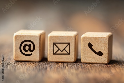 Three wooden blocks with contact icons at, email, and phone
