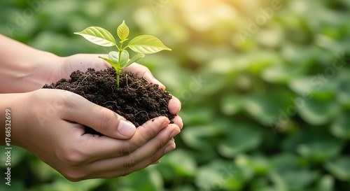 Hands carefully cradle a young sapling with fresh green leaves, symbolizing growth.