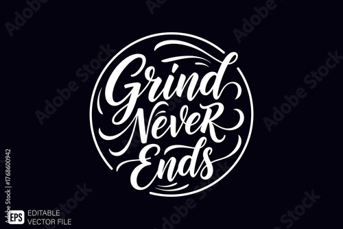 Grind Never Ends motivational quote in a circular hand-drawn typ