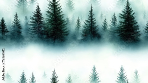 A dense forest enveloped in mist reveals tall trees and lush green foliage, creating a tranquil, mysterious environment at dawn SEAMLESS PATTERN