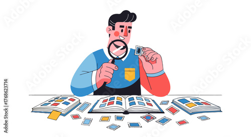 Enthusiastic Collector Inspecting Stamps in Album and Appraising Value with Magnifying Glass