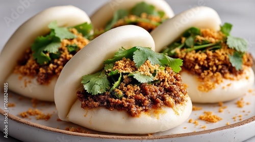 Delicious pork belly buns on a plate, garnished with coriander. Use this image for food blogs, restaurant menus, or recipe books.