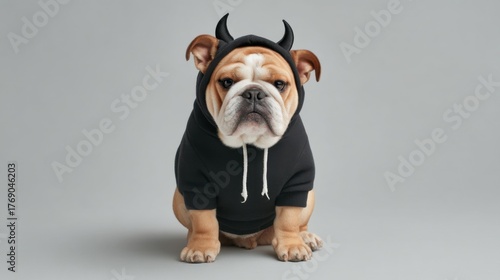 Adorable Bulldog in Black Bat Hood Costume Sitting Calmly on Gray Background