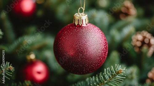 Crimson Ornament: A close-up showcases a solitary, vibrant red ornament hanging amidst the evergreen needles of a Christmas tree, evoking the holiday season's warmth and cheer.