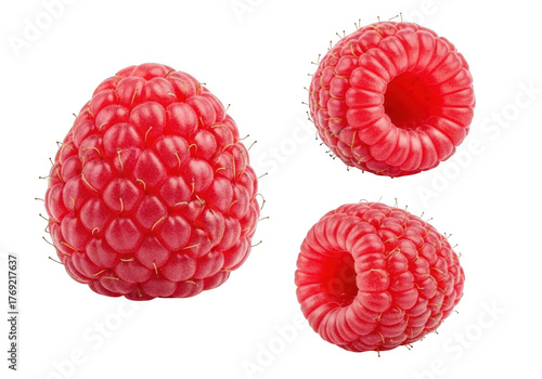 Three bright red raspberries isolated on a stark black background isolated on transparent background
