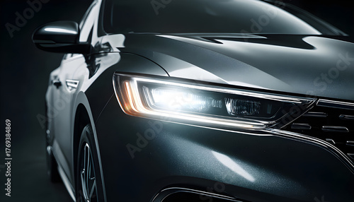 Close-up of a modern luxury car's front with illuminated LED headlights on a dark background.